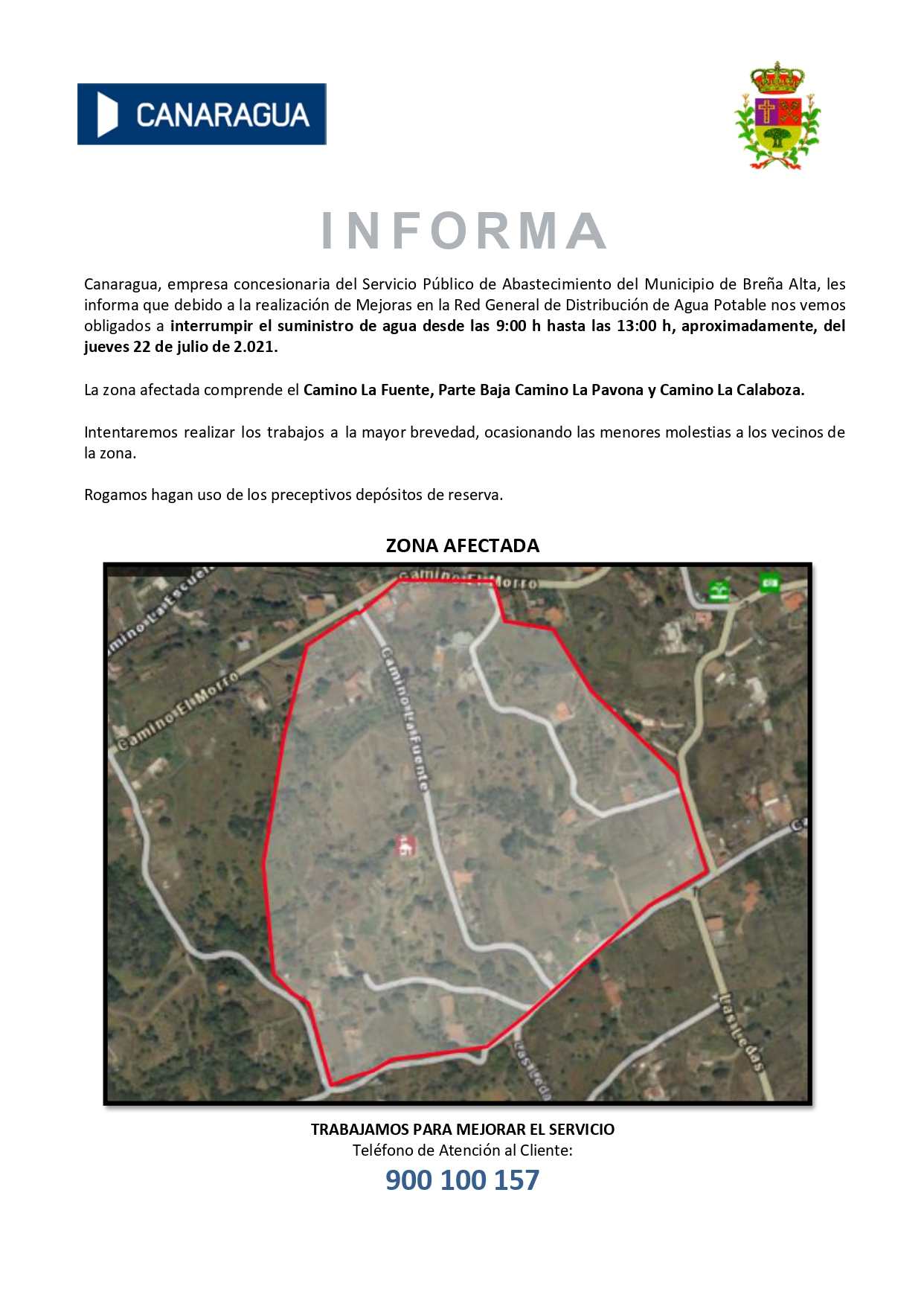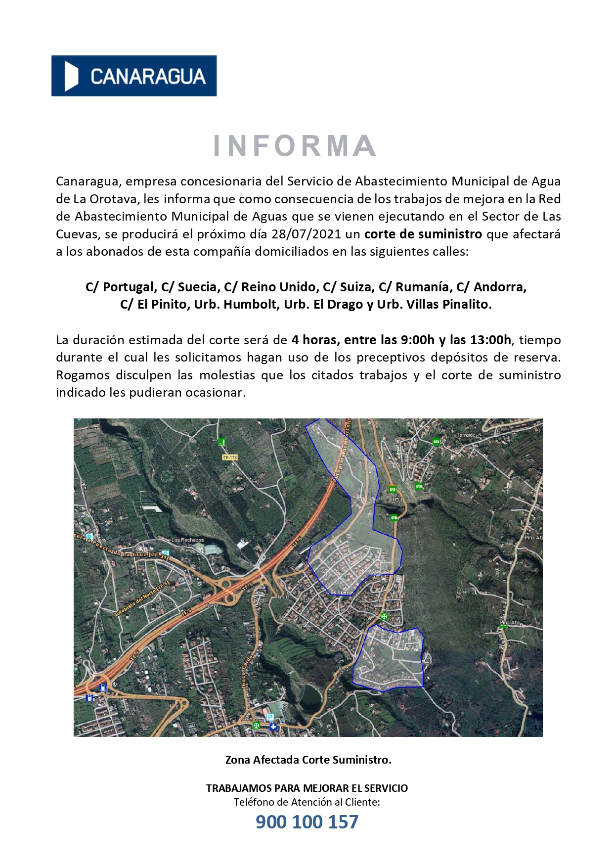 Canaragua, empresa concesionaria del Servicio Público de Abastecimiento del Municipio de La Villa y Puerto de Tazacorte, les informa que debido a la realización de las OBRAS DE LA NUEVA CIRCUNVALACIÓN de Tazacorte nos vemos obligados a interrumpir el suministro de agua desde las 7:00 h hasta las 14:00 h, aproximadamente, del miércoles 26 de julio de 2023.