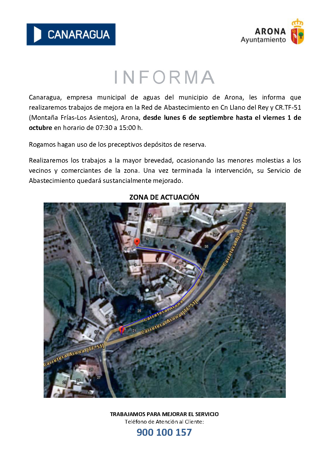 Canaragua, empresa municipal de aguas del municipio de Arona, les informa que realizaremos varios montajes hidráulicos para poner en servicio dos tramos de la nueva tubería de distribución que abastece a El Fraile, por lo que nos vemos obligados a efectuar un corte de Suministro en la zona del Fraile, Recta de Guargacho, Estrella del Sur, Arsenio Rguez, Lomo Negro y alrededores desde las 07:30 h. hasta las 15:00 h. aproximadamente del martes 21 de octubre de 2025.