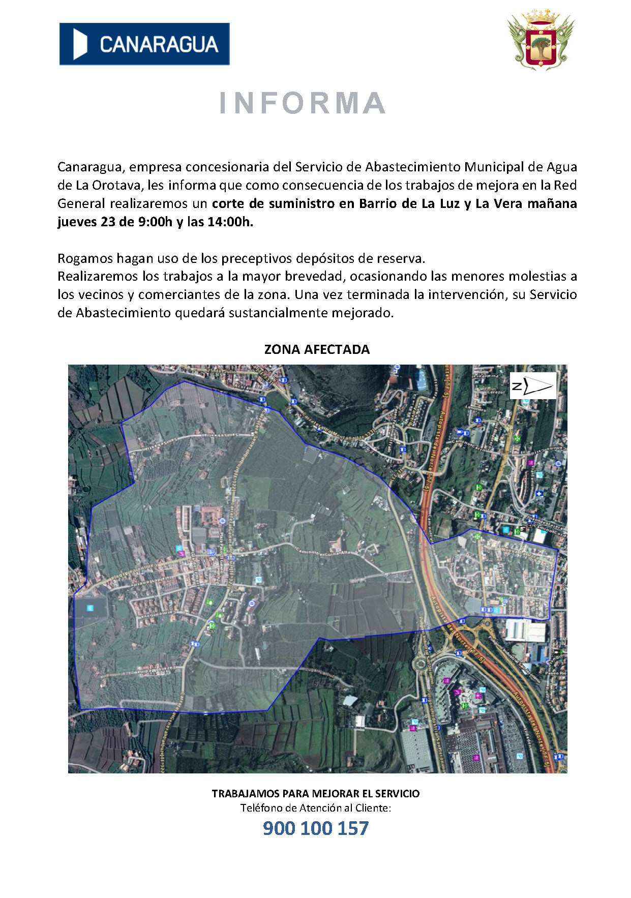 Canaragua, empresa de Abastecimiento y Saneamiento del municipio de La Orotava, les informa que realizaremos trabajos de mejora en la Red de Abastecimiento en Calle Sor Soledad Cobián, por lo que nos vemos obligados a realizar un corte de suministro. Estas actuaciones se realizarán el miércoles de octubre de 2024 en horario de 9:o0 a 12:00 h.